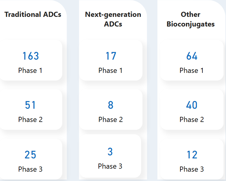 From clinical to approved, covering over 450 ADCs and other conjugates with drug-, indication-, and trial-level details.
